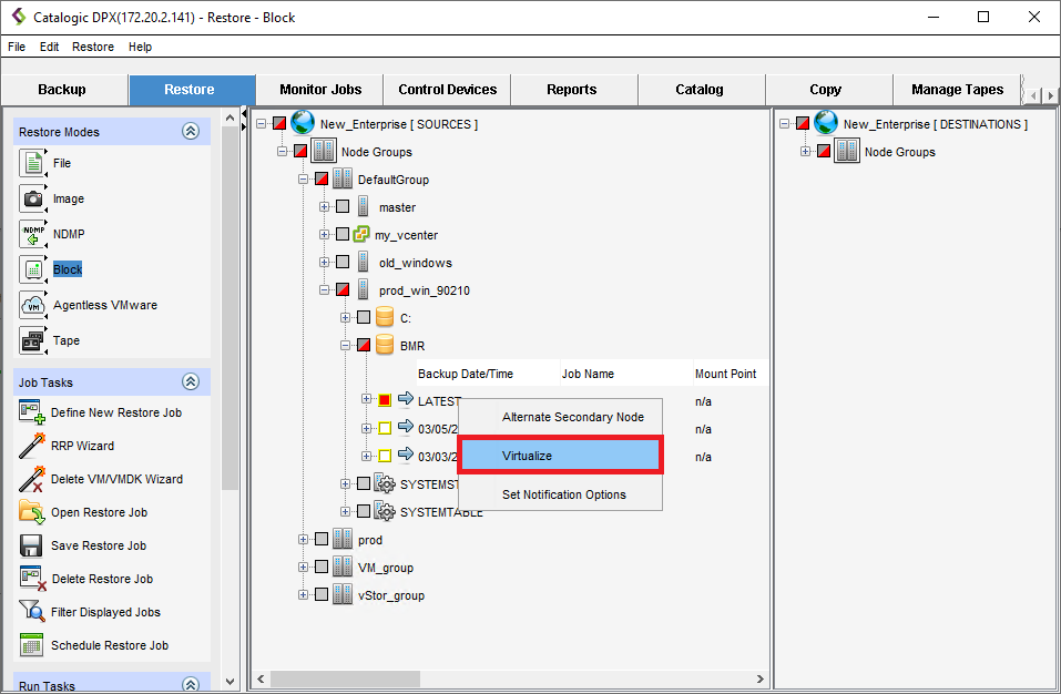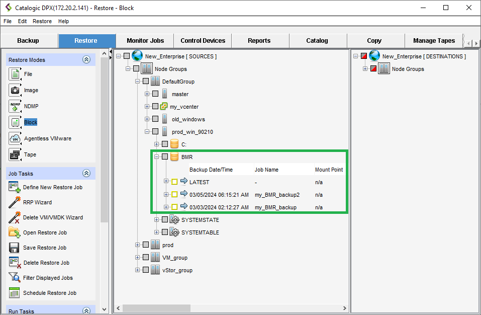 1. In the Sources pane, drill down to find the BMR backup within the node you want to restore.
