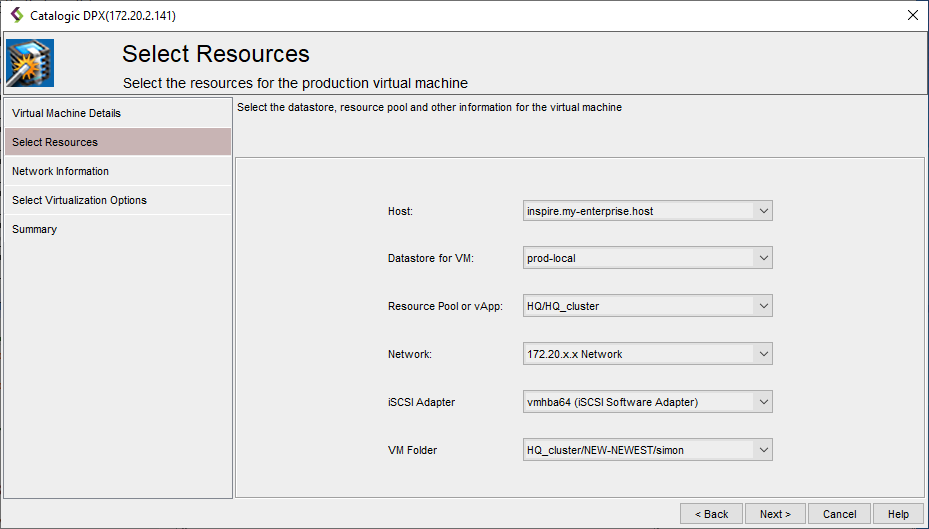 1. In the Select Resources step, specify the Host, Datastore, Resource Pool/VApp, Network, iSCSI Adapter and the VM Folder where the new VM will be logically located. Click Next.
