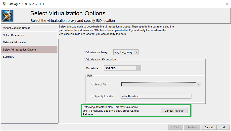 If you want to manually specify the ISO location, click Cancel Retrieve and then select the Specify Location radio button.