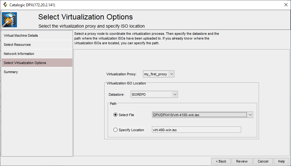 2. Indicate the Virtual ISO Location. You will need a virtualization ISO of the operating system required for your machine (Linux or Windows). Normally, you will obtain it from the appropriate MySupport DPX Virtualization Support section. If in doubt, contact our Technical Support team.