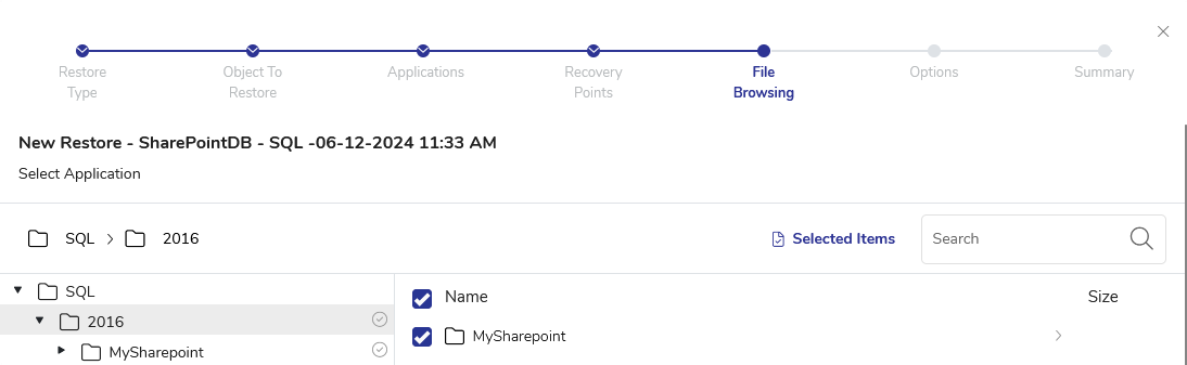 - The Object to Restore view shows all Application nodes that you backed up. The available objects to restore can be sorted by Name, Type, associated Job Name, or the backup Date/Time. Locate and select the node containing the Sharepoint Server you want to restore and click Next.