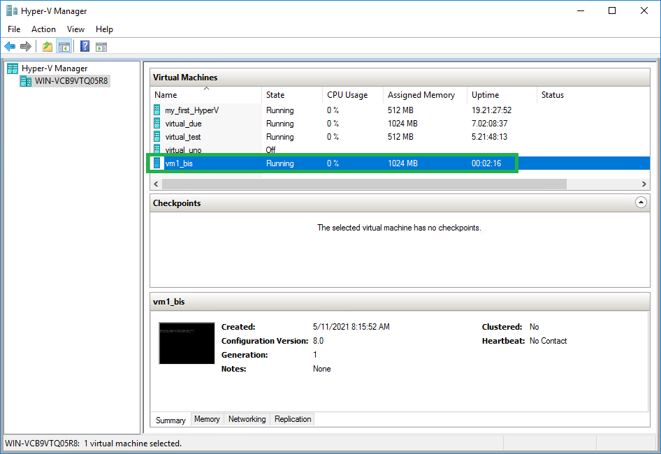 After a successful job run, the restored virtual machine will be visible in the Hyper-V Manager: