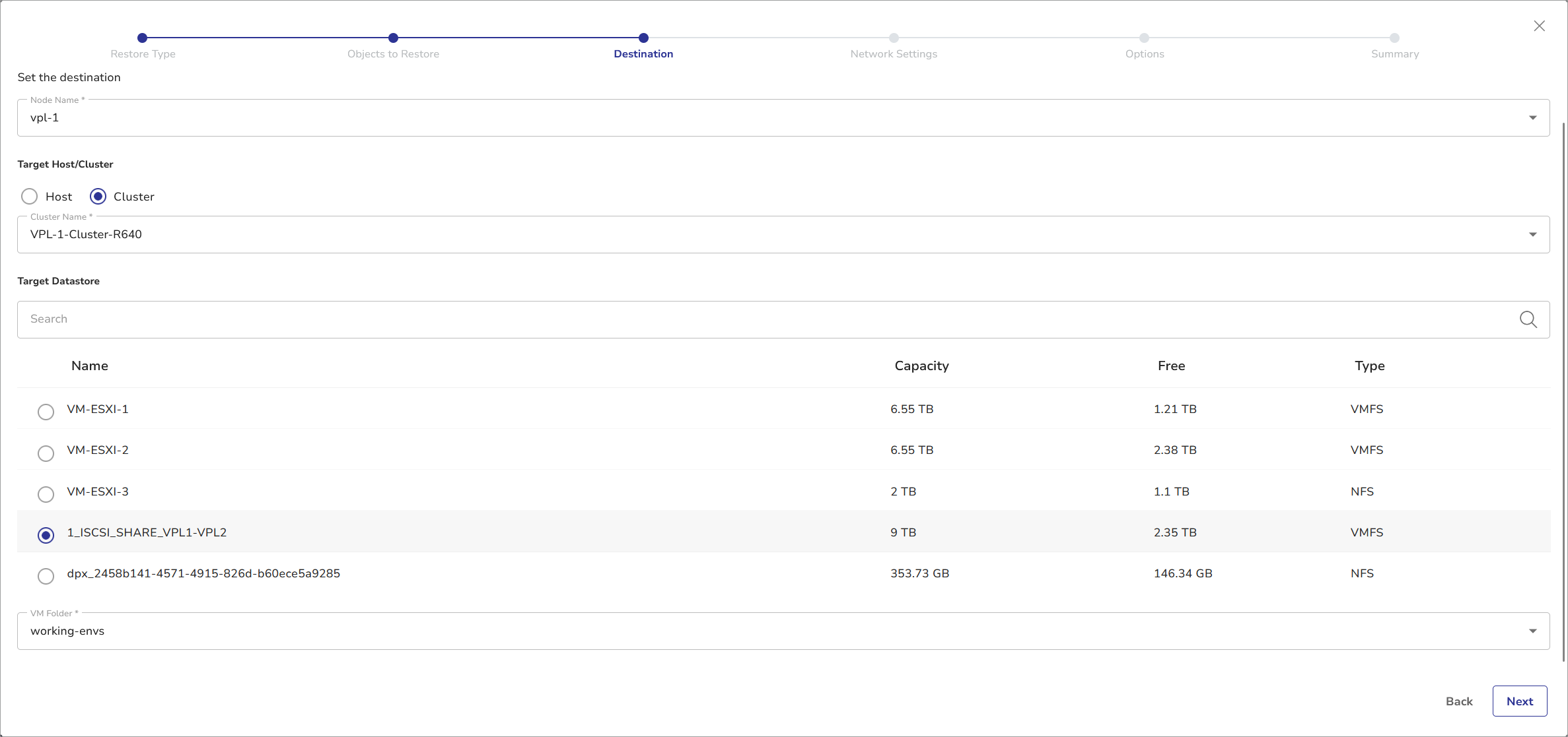 - Select the target datastore from the list. You can narrow down the displayed list by searching by the datastore name, or sort the list by Name, total Capacity, Free capacity or Type.