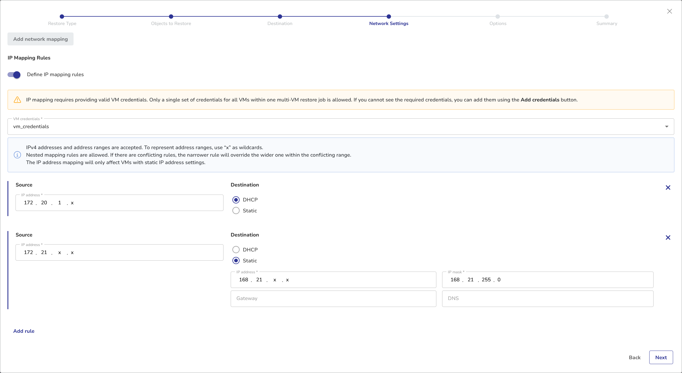 The IP Mapping Rules feature allows you to map specific static IPv4 addresses and address ranges of source VMs to new addresses and ranges of the restored machines. This allows the user to control output IP addresses of the restored machines, e.g. should the original addresses be unavailable.
