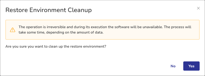 - The Restore Environment Cleanup dialog will display. Click Yes to start the cleanup process. It will take some time, depending on the amount of data.