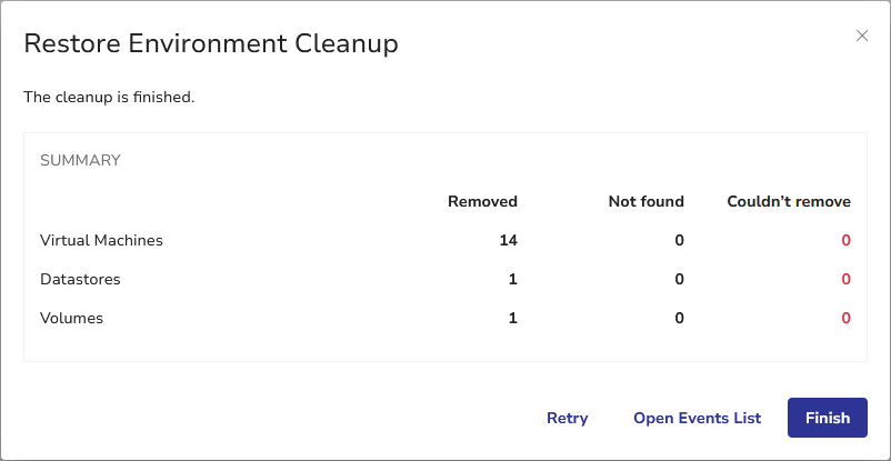 When the process is finished, the summary dialog will show the cleanup results. If all resources are cleaned up successfully, the Multi-VM Restore job item will disappear from the Unfinished Restores view.