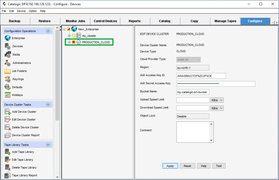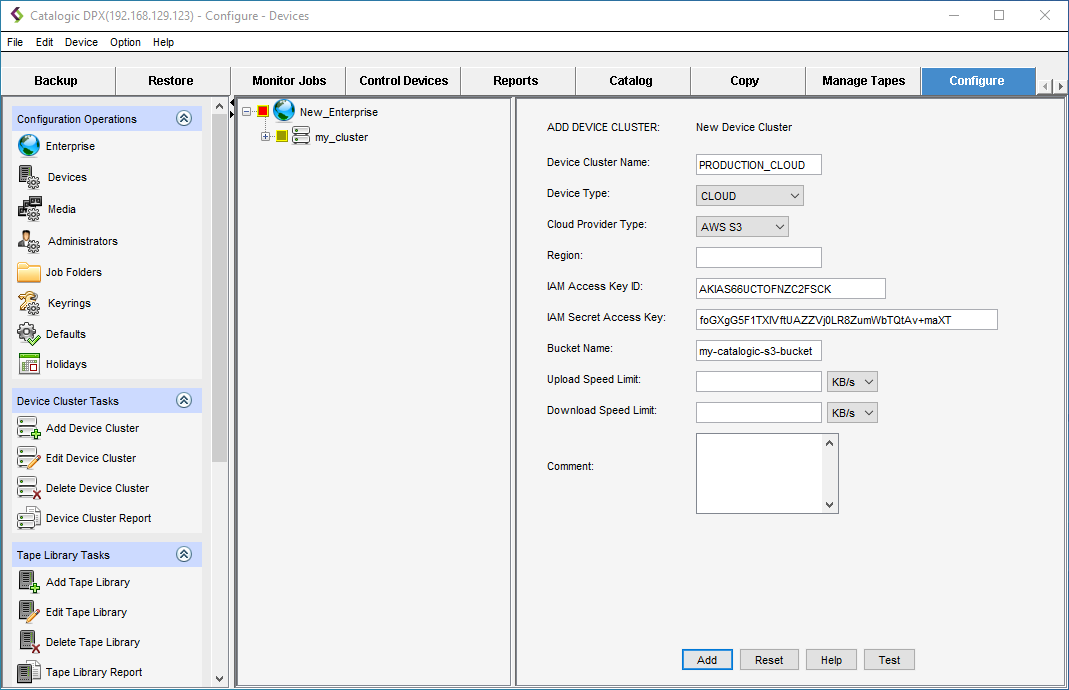 A device cluster is a logical grouping of non-tape library (standalone) backup devices. Follow these steps to add and configure AWS S3 for Agentless VMware and Block archiving.
