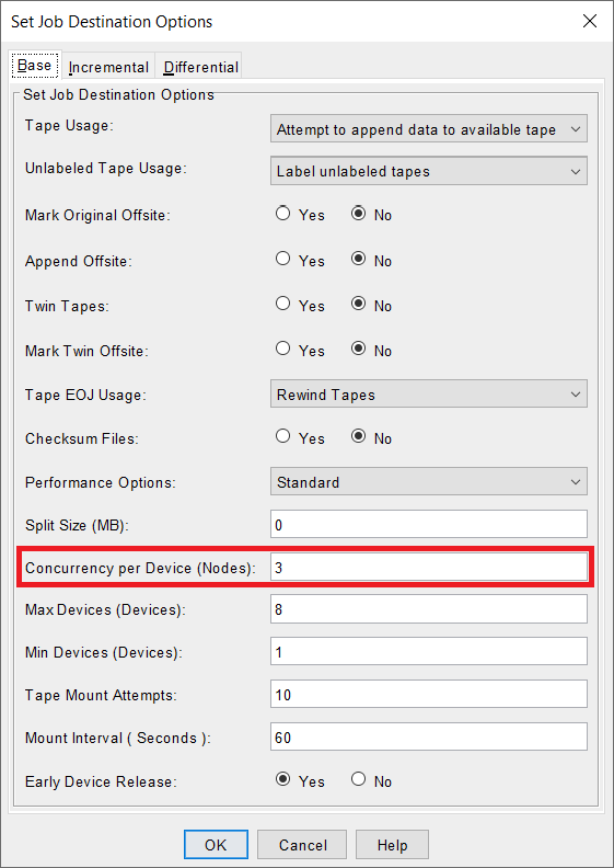- In the Set Job Destination Options dialog, change the value in the Concurrency per Device field to different from 1. This field sets the maximum number of file backup tasks to a single device.