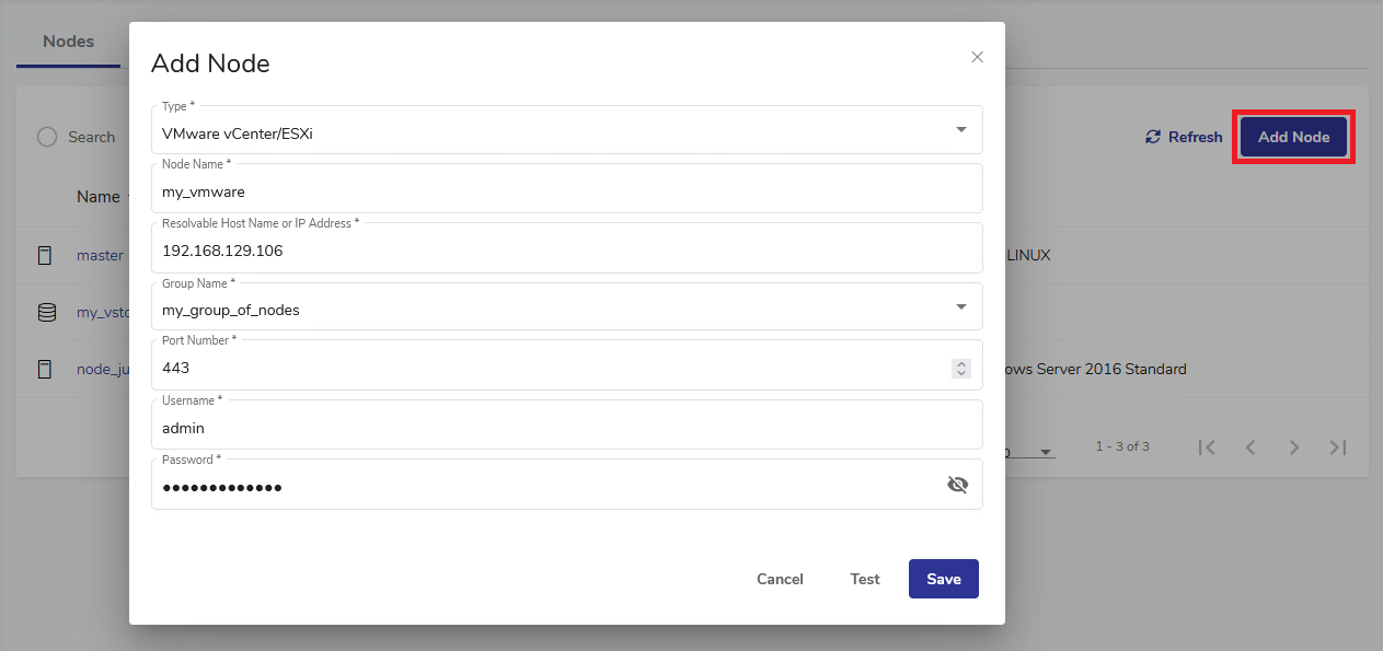 - Click Test to verify the node parameters and credentials (this step is optional but is recommended, as no connection validation is run when saving a new node).
