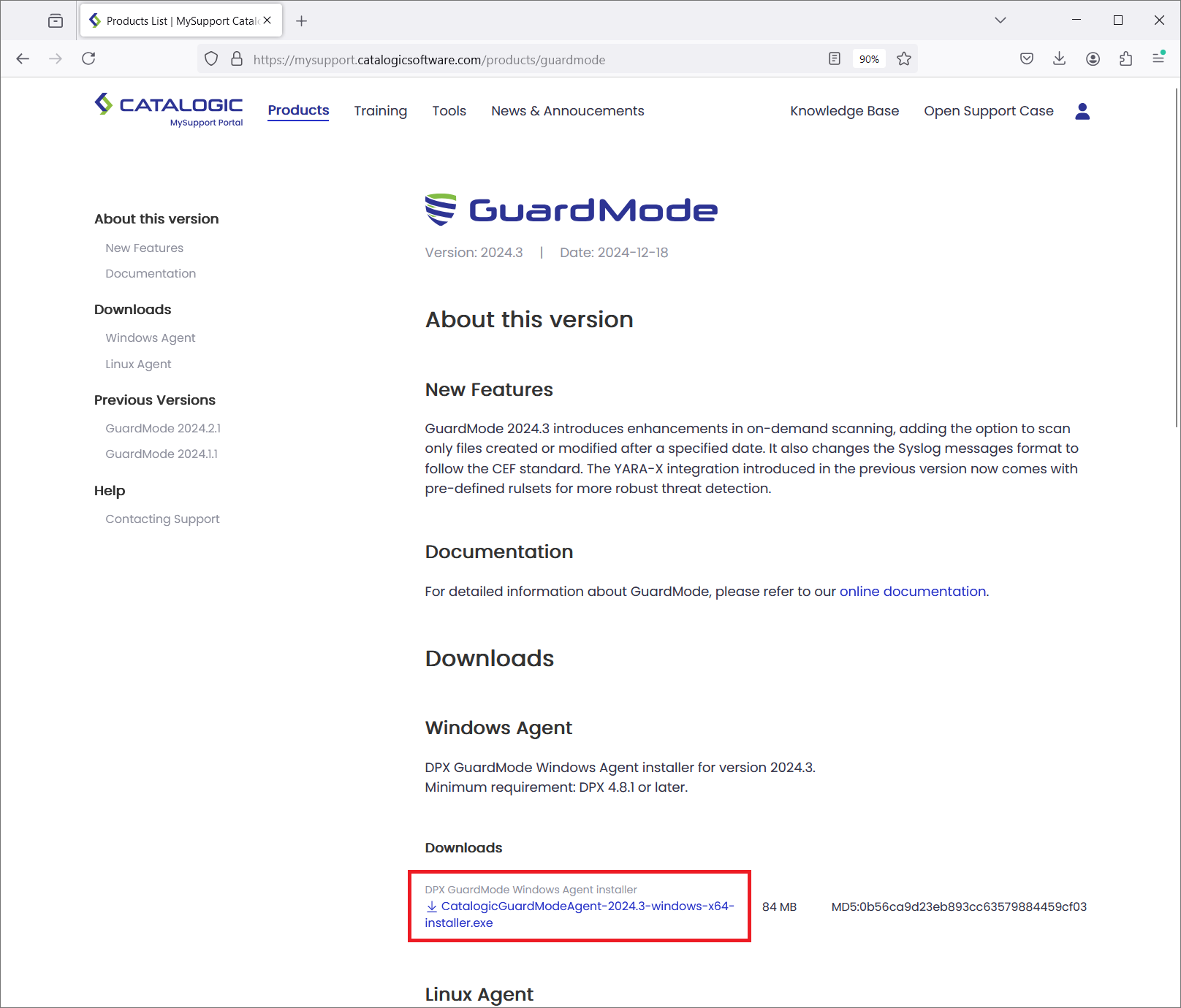 Go to the Catalogic MySupport website. Select the latest version of GuardMode Agent and click the installer download link.