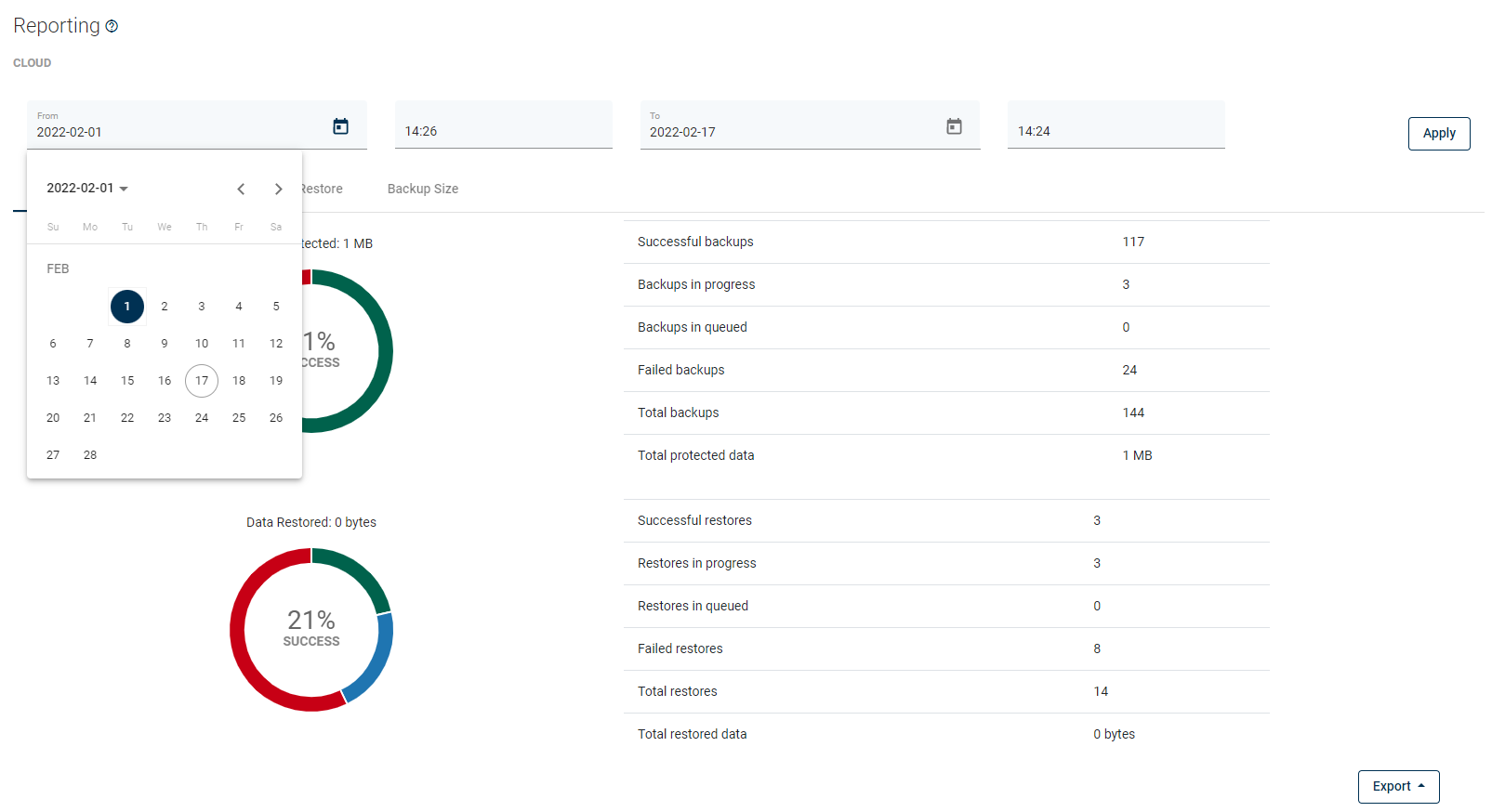 From here, you can set a date range or go to a detailed summary of backup, restore jobs, and backup size.