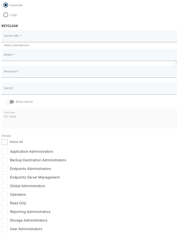 Server URL- Keycloak server URL (if you want to use fqdn of server url you need to use DNS on Server machine or add line in/etc/hosts, for example: '1.2.3.4 dc.fqdn.address')Realm- Name of the realm configured in KeycloakResource- Name of the client configured in keycloakSecret(optional) - Credential secret, if configured in Keycloak