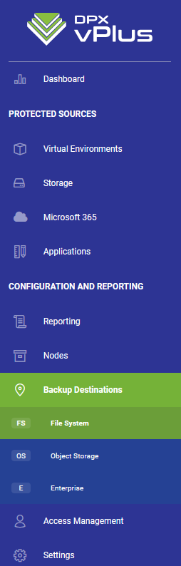 /etc/sudoers.d/directory to enable thevprotectuser to execute privileged script (like chown operations in some file system locations):%vprotect ALL=(root) NOPASSWD: /opt/vprotect/scripts/myscripts/privileged.sh - Open the "BACKUP DESTINATIONS" section from the left menu: