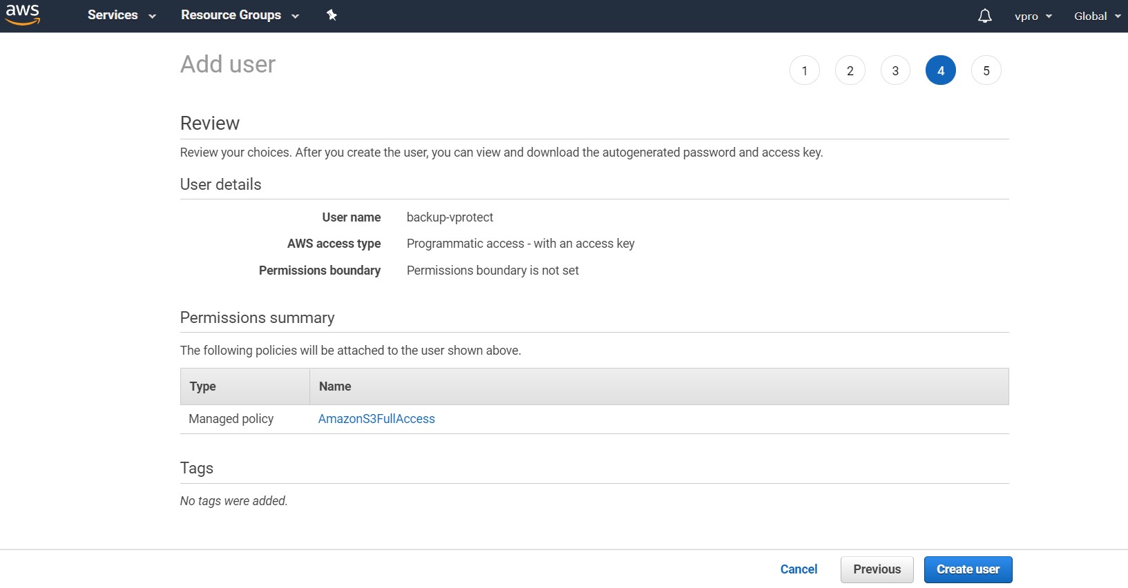 After creating a bucket, we need to create a new user with appropriate permissions: