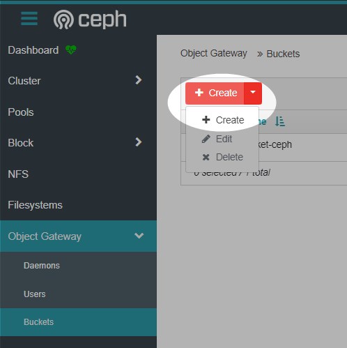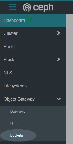 Log in to the Ceph dashboard. Open Object gateway and then go to "Buckets".