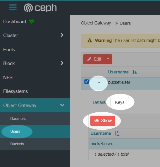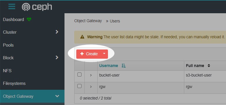 Now create a dedicated access account for the backup destination. Open the Users tab under the object gateway menu.