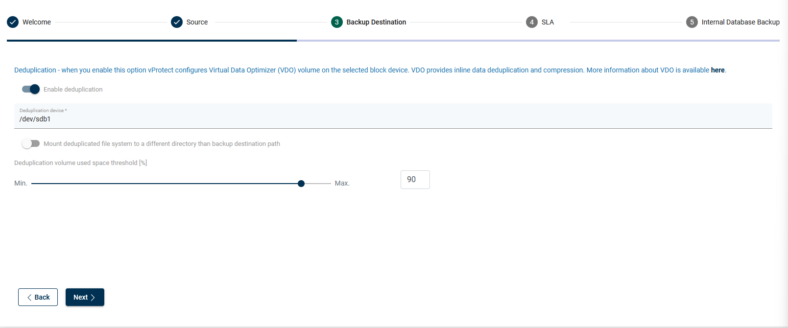 Choose, if you want to use deduplication based on Virtual Data Optimizer (VDO).