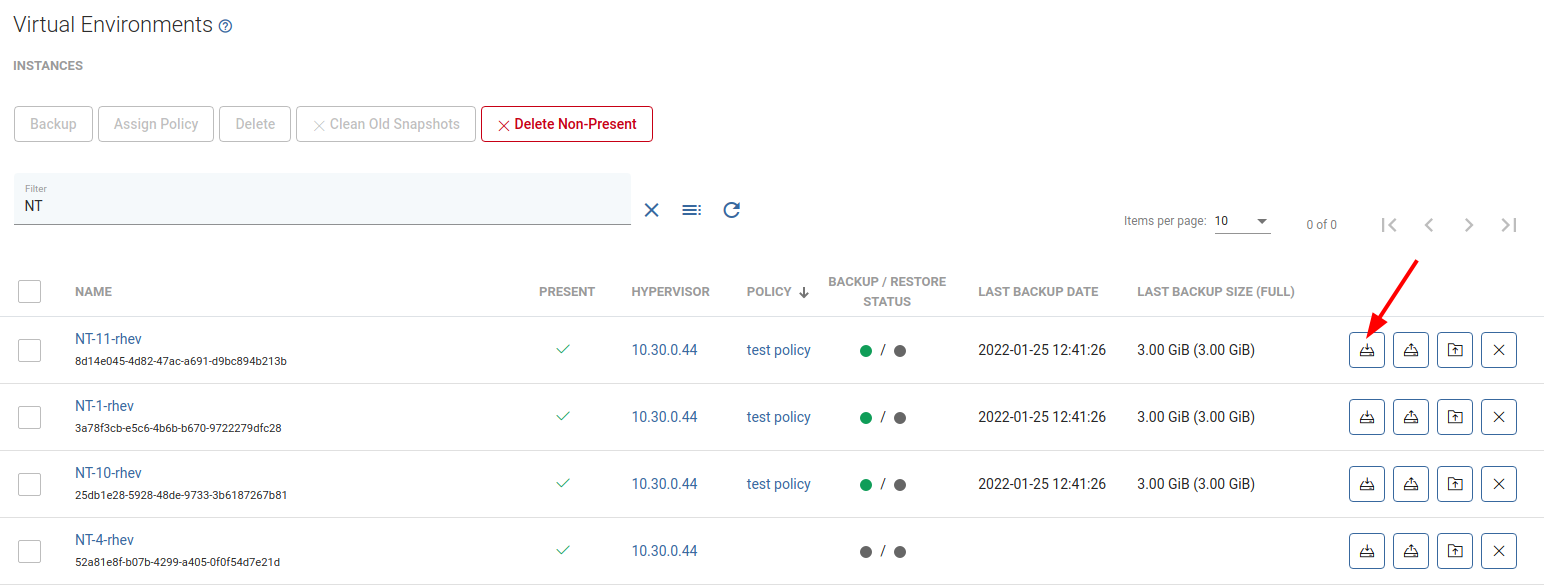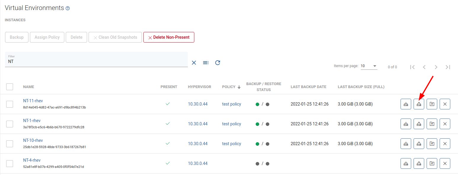 Search for VE instance you want to back up and click Backup the button next to it.