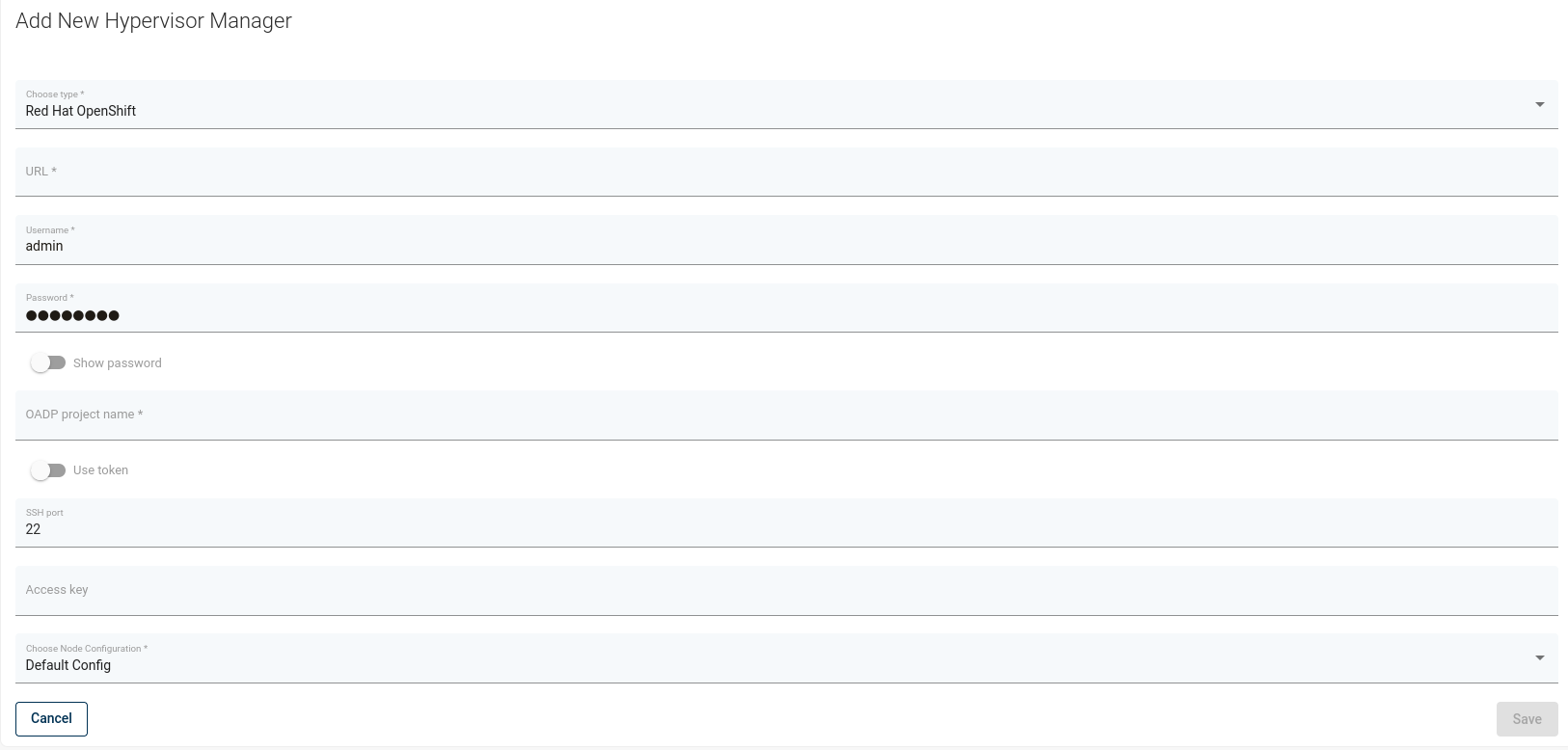 • Please provide the URL to the Openshift API, credentials to the cluster and OADP project name when creating the OpenShift hypervisor manager in vPlus WebUI. This is needed for vPlus to have access to your cluster deployments.