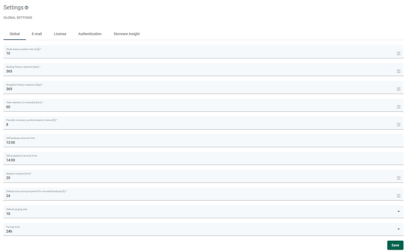 Node status update interval- how often nodes should update their statusBackup history retention- how long should the history of backups be kept (even removed from backup provider)Task retention (in console)- how long finished/failed tasks should be kept in the console in UI/CLIPeriodic inventory synchronizarion interval- how oftenDPX vPlus should scan for changes in VM inventory on HV/HVMs and Microsoft 365 users accounts, sites, and teamsOld backups removal time- time, when daily backup destination cleanup should be invoked (for all backup destinations)Old snapshots removal time- time, when daily snapshots cleanup should be invoked (for all VMs with any policy assigned)Session timeout [min]- Session timeout [min] - the time after which you will be logged out of the WebUIDefault paging size- Default value of items shown on listsFormat time- you can choose between 12h and 24h time format