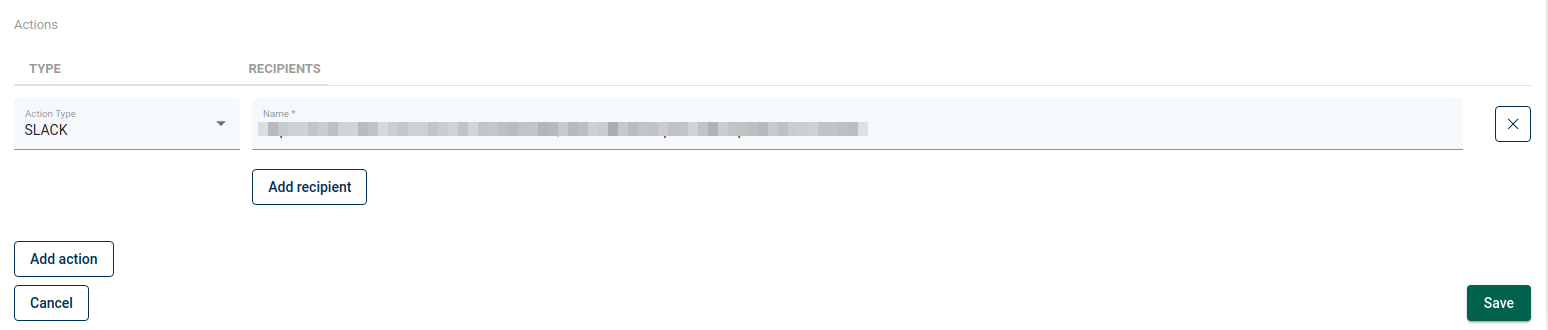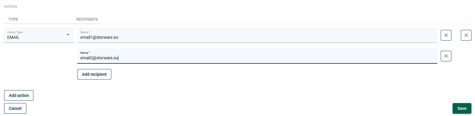Click Add Action button, choose Action Type from a list, add one or more recipients passing their email addresses.