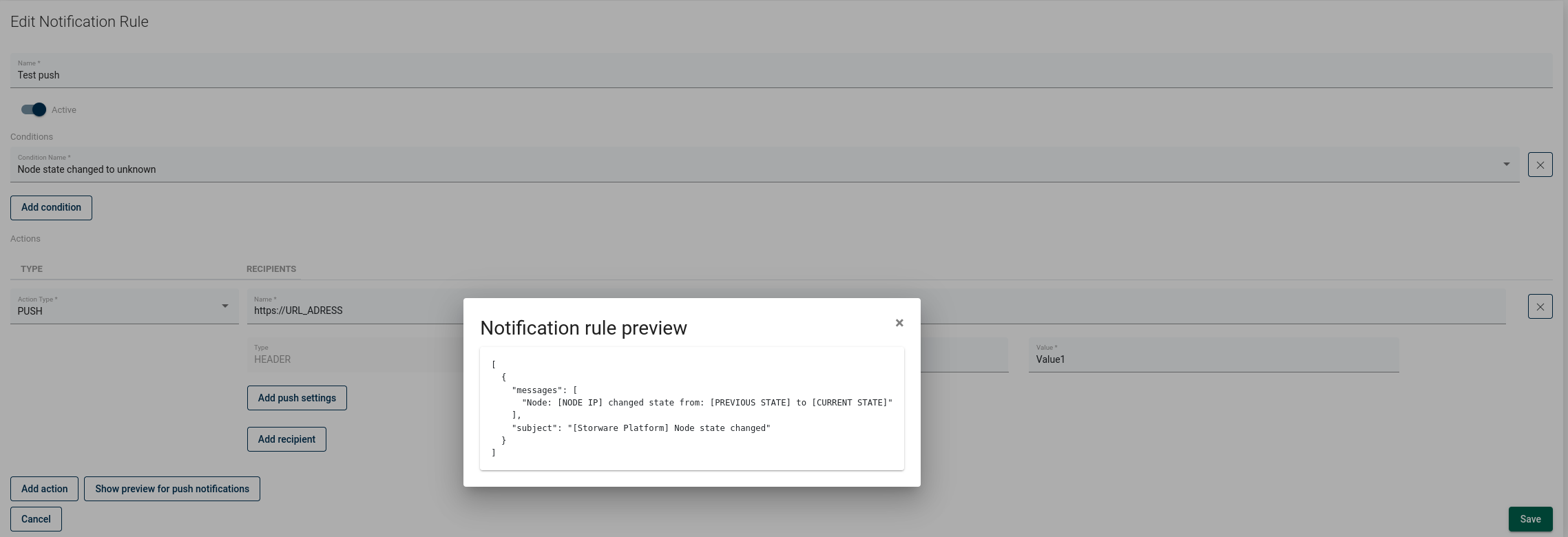 To configure a push notification, provide URL of endpoint address, where you want to receive notifications and add if needed custom headers that will be added to POST request with notification.\