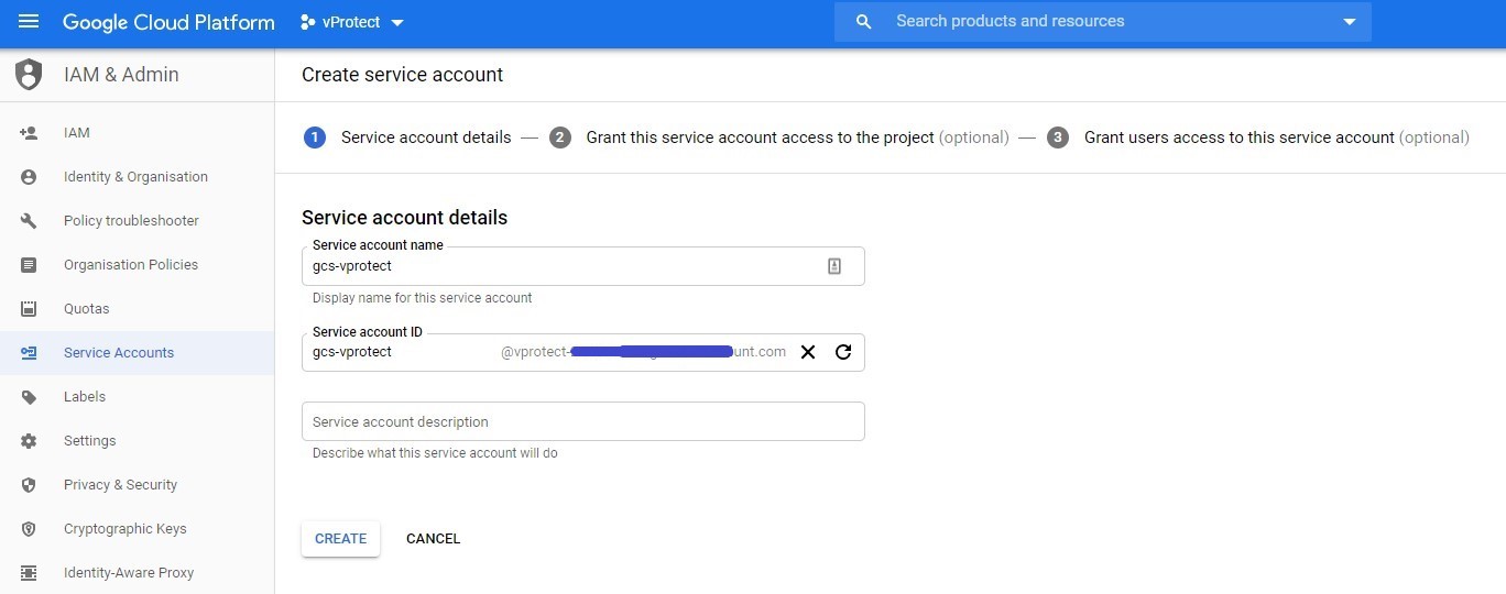 Generate a service account key: Click here for more info about Creating service account keys. The service account key should have the Role set to Storage Admin and Service Usage Consumer.