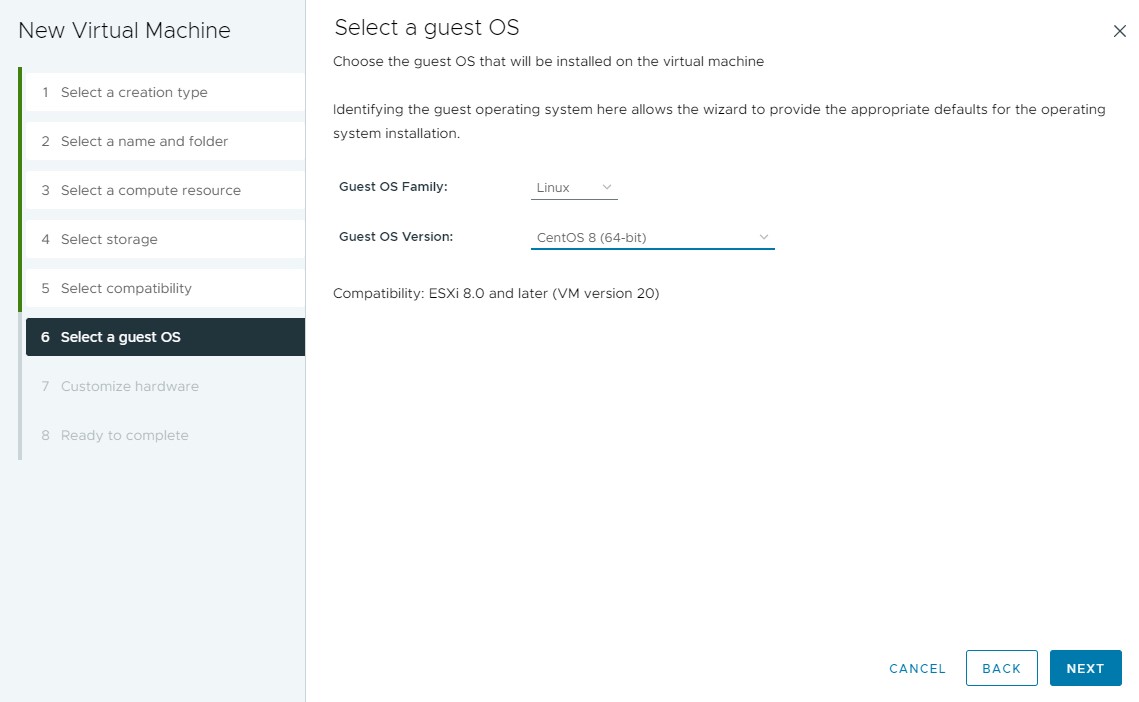Select the guest operating system - ideally CentOS Linux 9. If unavailable, choose CentOS 8.