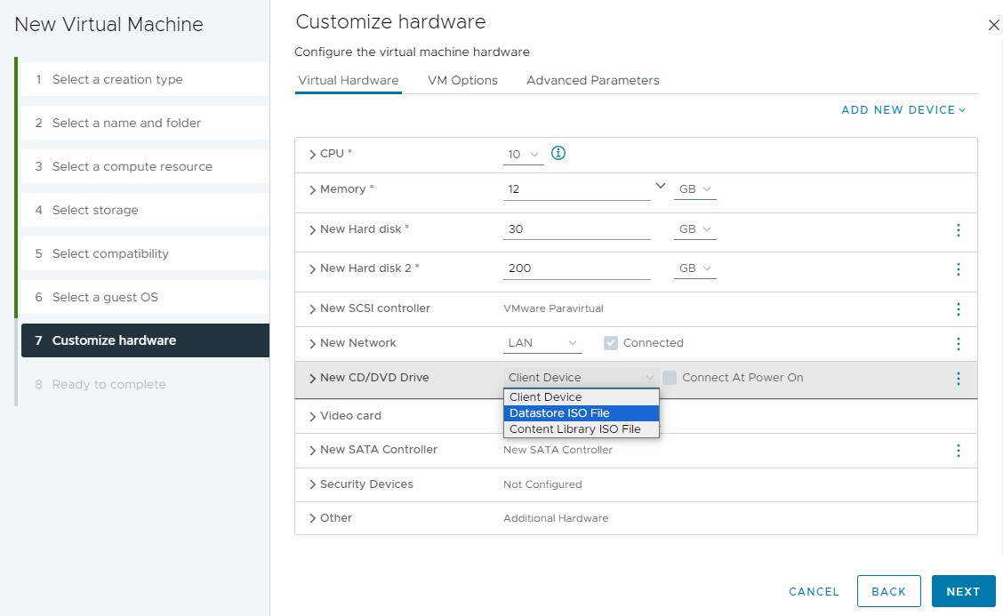 In the next step, select "Datastore ISO File" as the CD/DVD drive source.