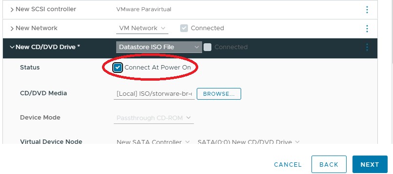 Ensure "Connect at power on" is checked for the CD/DVD drive.