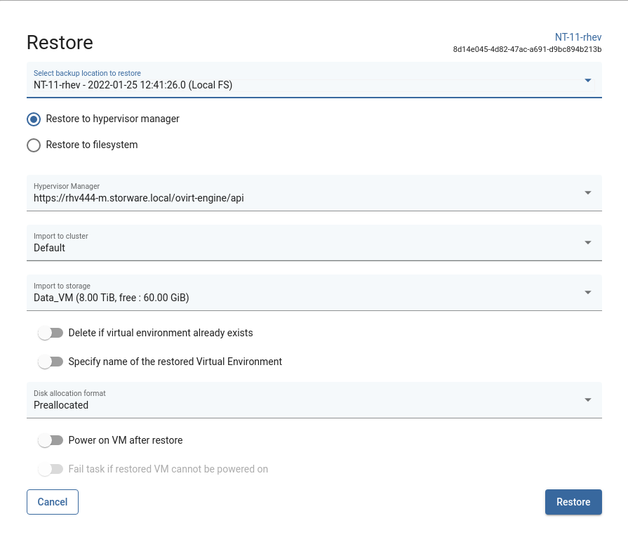 In the next window, choose if you want to restore to the file system or directly to the hypervisor (or hypervisor manager). Enter the rest parameters according to your needs and click Restore the button. The available parameters may differ depending on the hypervisor.