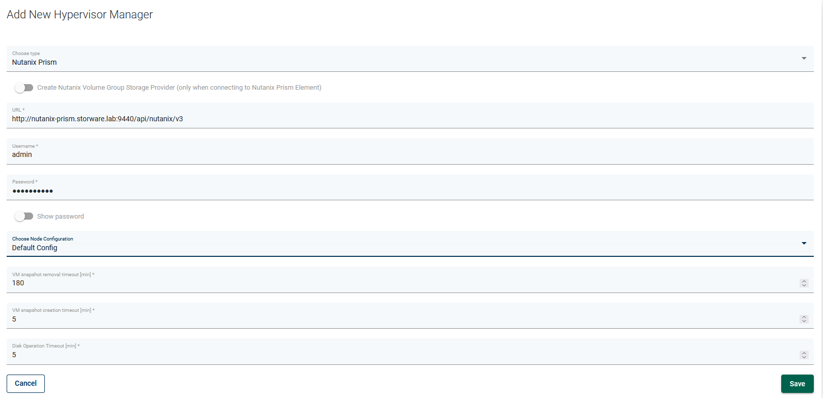 - You can specify either a Prism Element or a Prism Central as hypervisor manager. If Prism Central is specified credentials for Prism Central and each Prism Element must be the same.