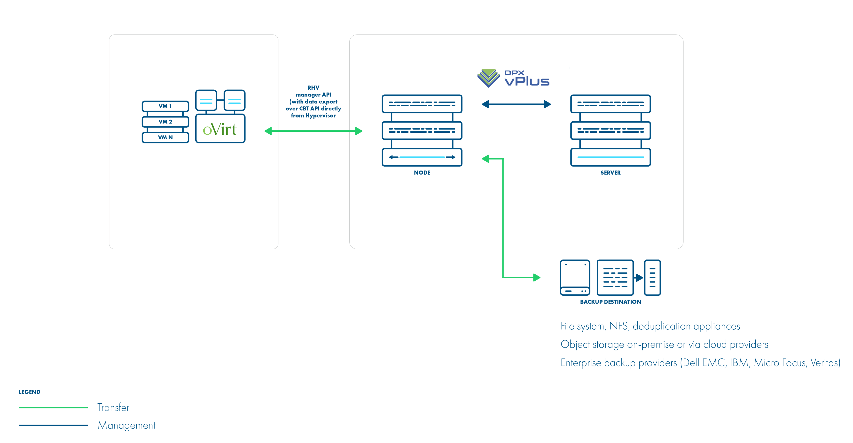 This is an enhancement for disk image transfer API strategy. It allows DPX vPlus to use oVirt API v4.2+ (HTTPS connection to oVirt manager) only to collect metadata. Backup is done over SSH directly from the hypervisor (optionally using netcat for transfer), import is also using SSH (without the netcat option). There is no need to install a node in the oVirt environment. This method can significantly boost backup transfers and supports incremental backups.
