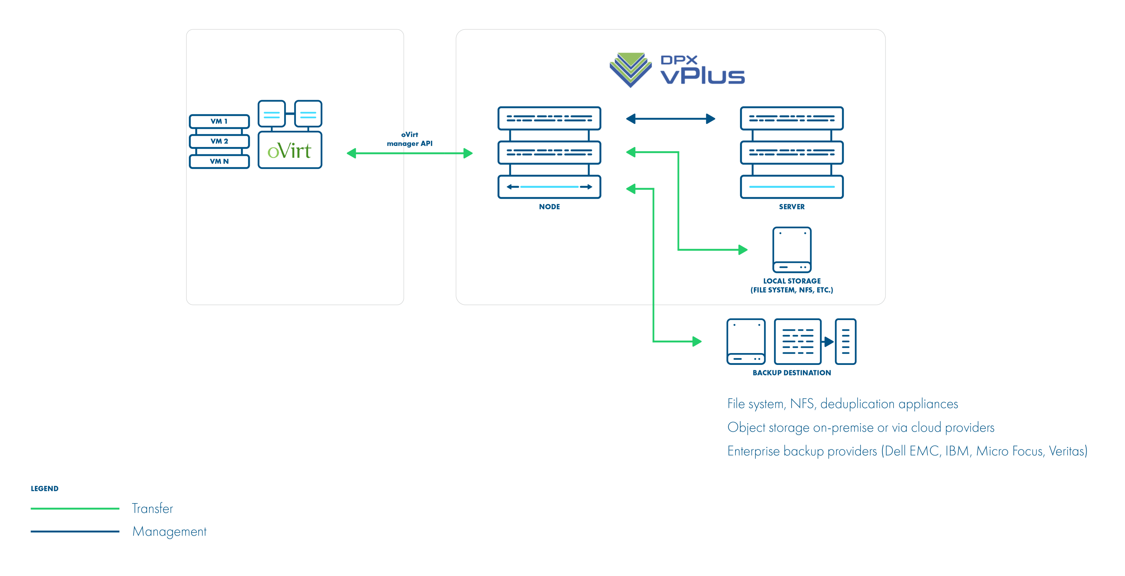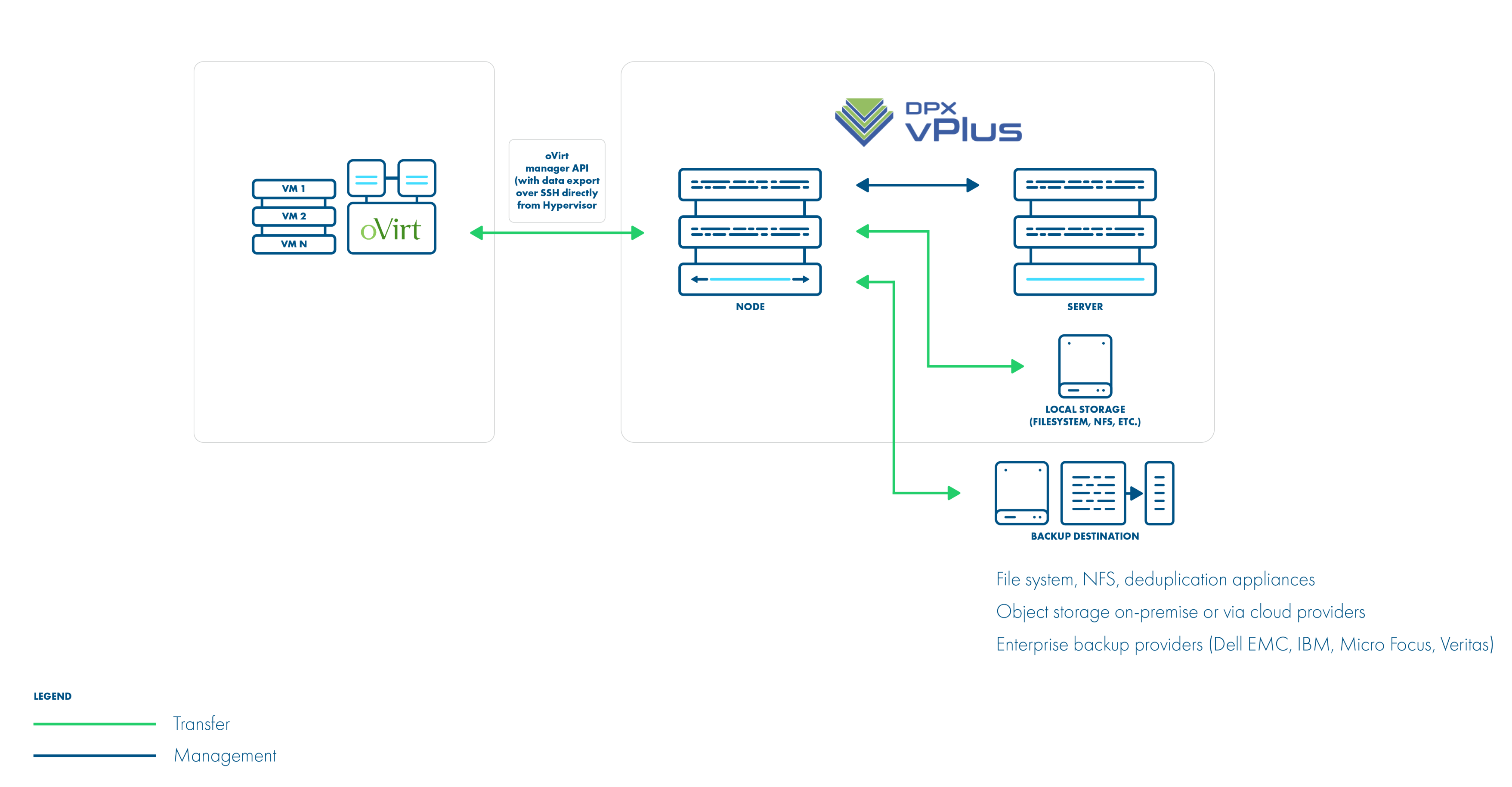 This strategy supports incremental backups. Assuming you have oVirt 4.2 or newer – just add your manager to DPX vPlus and the setup is done. From a network perspective, it requires two additional ports to be opened - 54322 and 54323 - and your data to be pulled from the hypervisor manager.