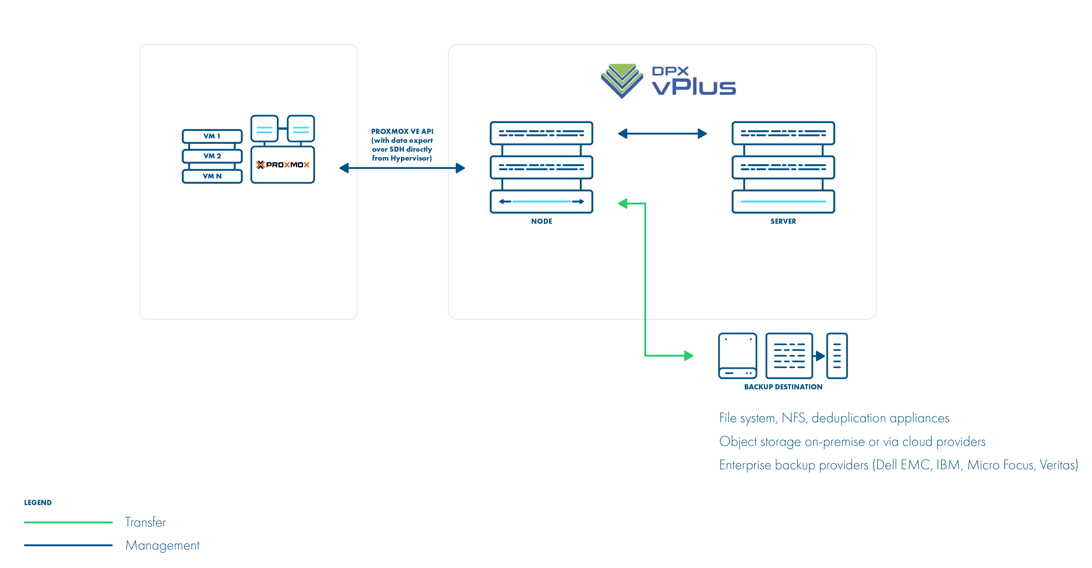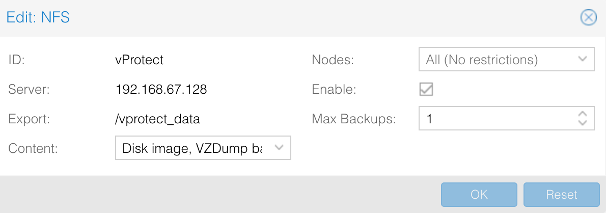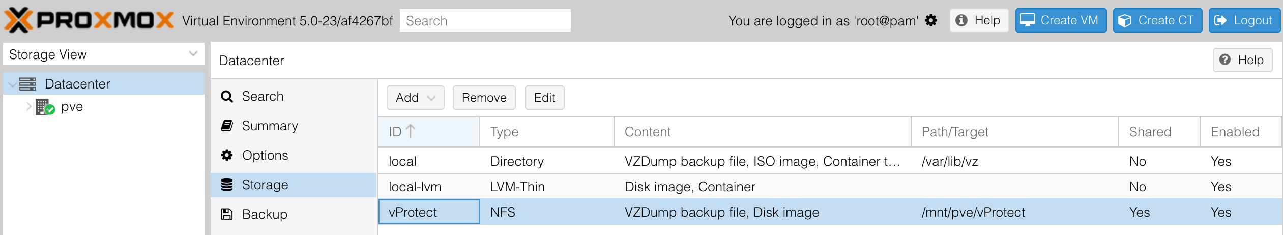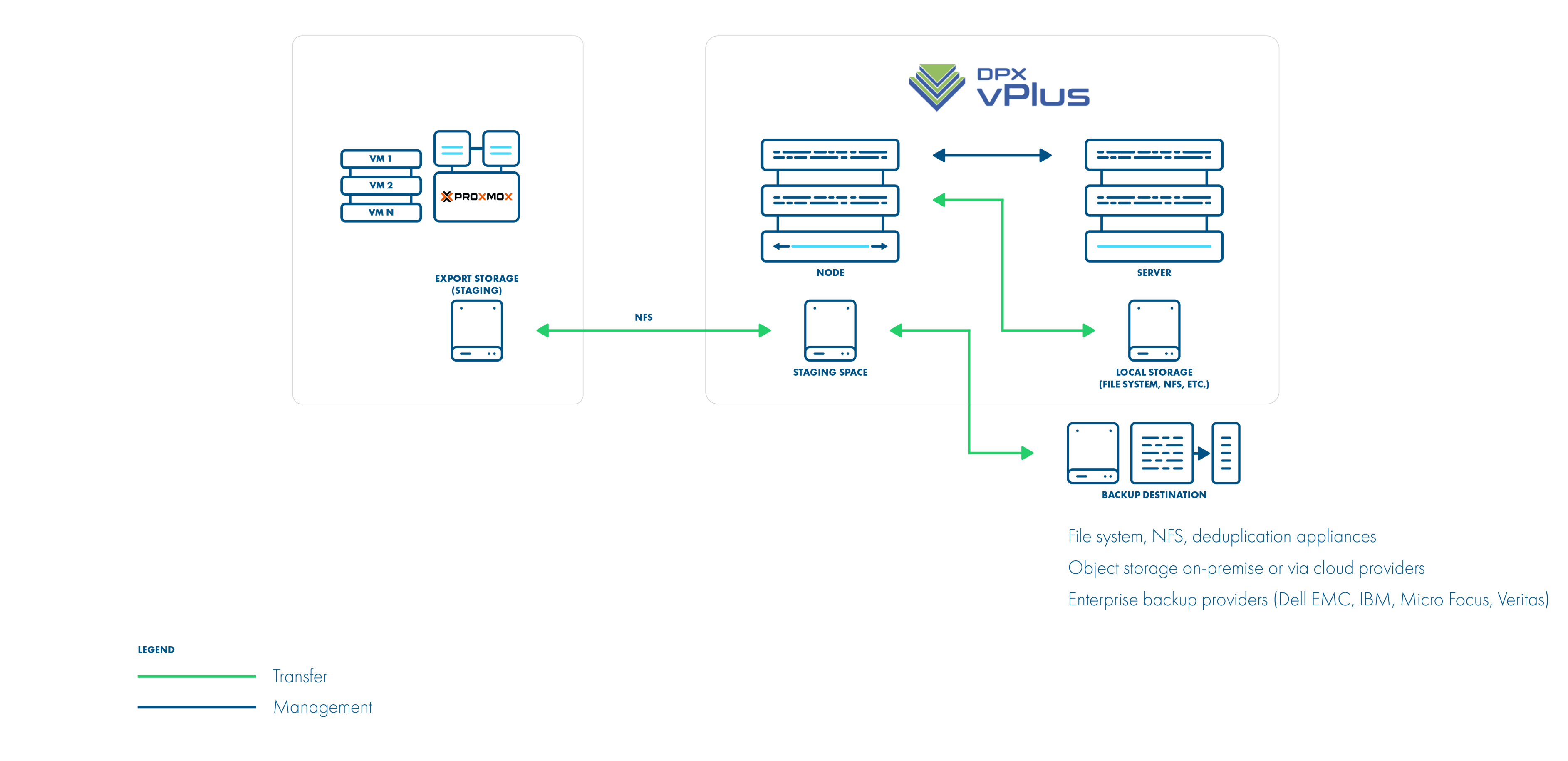 Proxmox virtual environments require backup storage to be defined on each server. This storage must be a location accessible from DPX vPlus Node (the simplest setup, when you use only 1 node, is to create NFS share for the staging path on DPX vPlus Node)