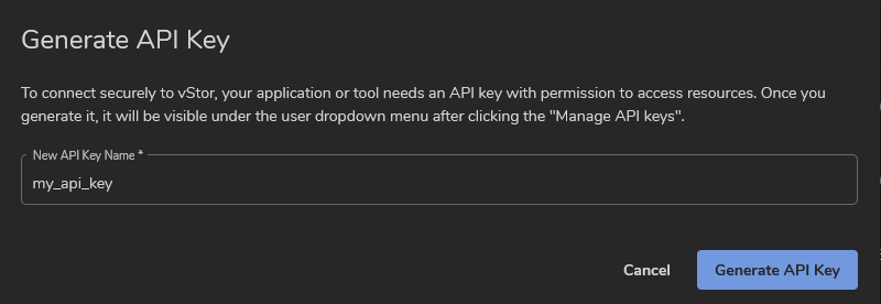 vStor allows generating API keys that can be used to authenticate with DPX instead of a username and password. This provides an alternative way to connect vStor nodes to DPX.