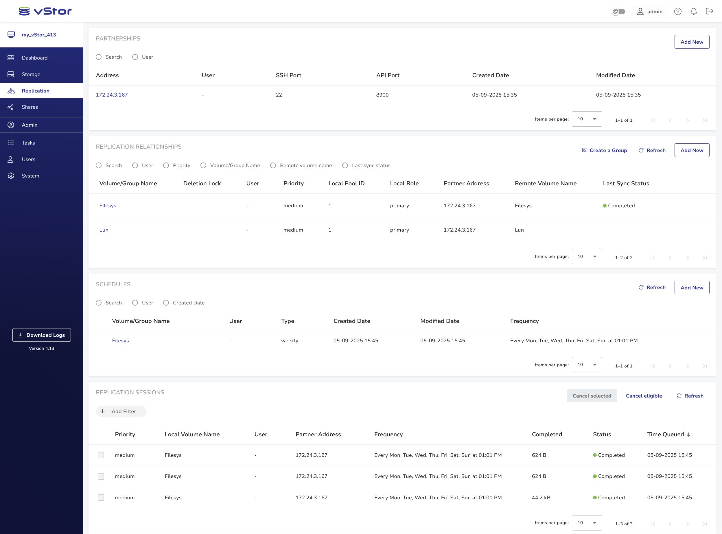 This section displays partner vStors configured for replication.