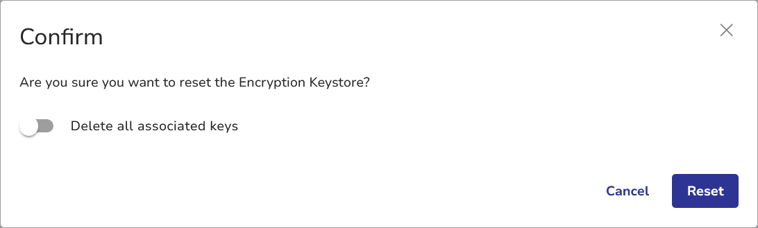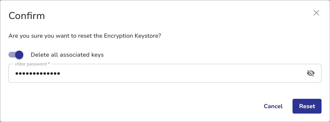 Click Reset. The Encryption Keystore configuration will be cleared and all keys stored remotely by your vStor will be deleted from the remote location.
