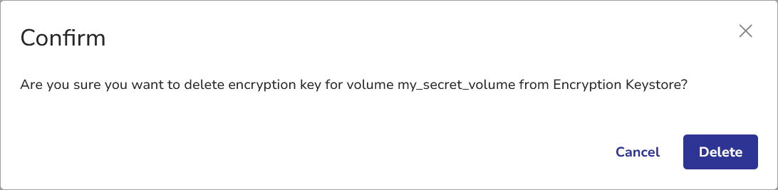 To delete a key from Encyption Keystore, hover over a row with Encryption Key added and click theicon. You will be prompted to confirm your decision. Click Delete.