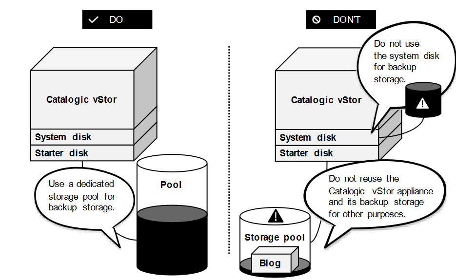 - Never create a backup storage pool on the System Disk of the Catalogic vStor appliance.