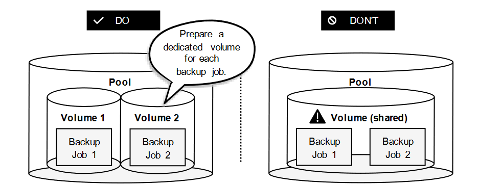 - Use one volume for one backup job to avoid complexity and potential issues.