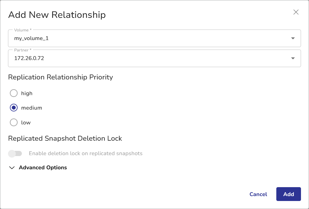 - Select the volume you want to replicate and the replication partner.