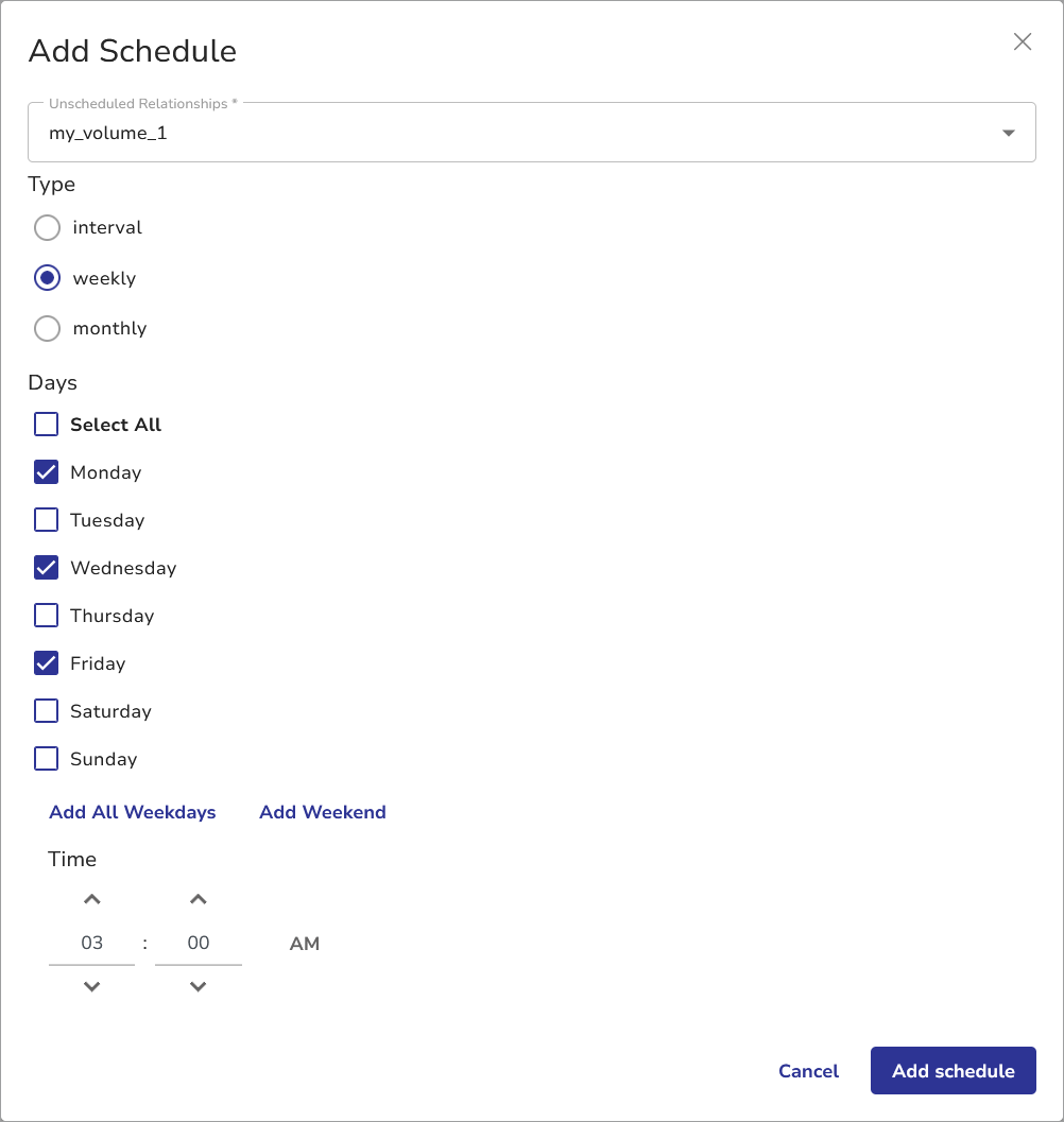 Choose the schedule type (interval, weekly or monthly) and select schedule details.