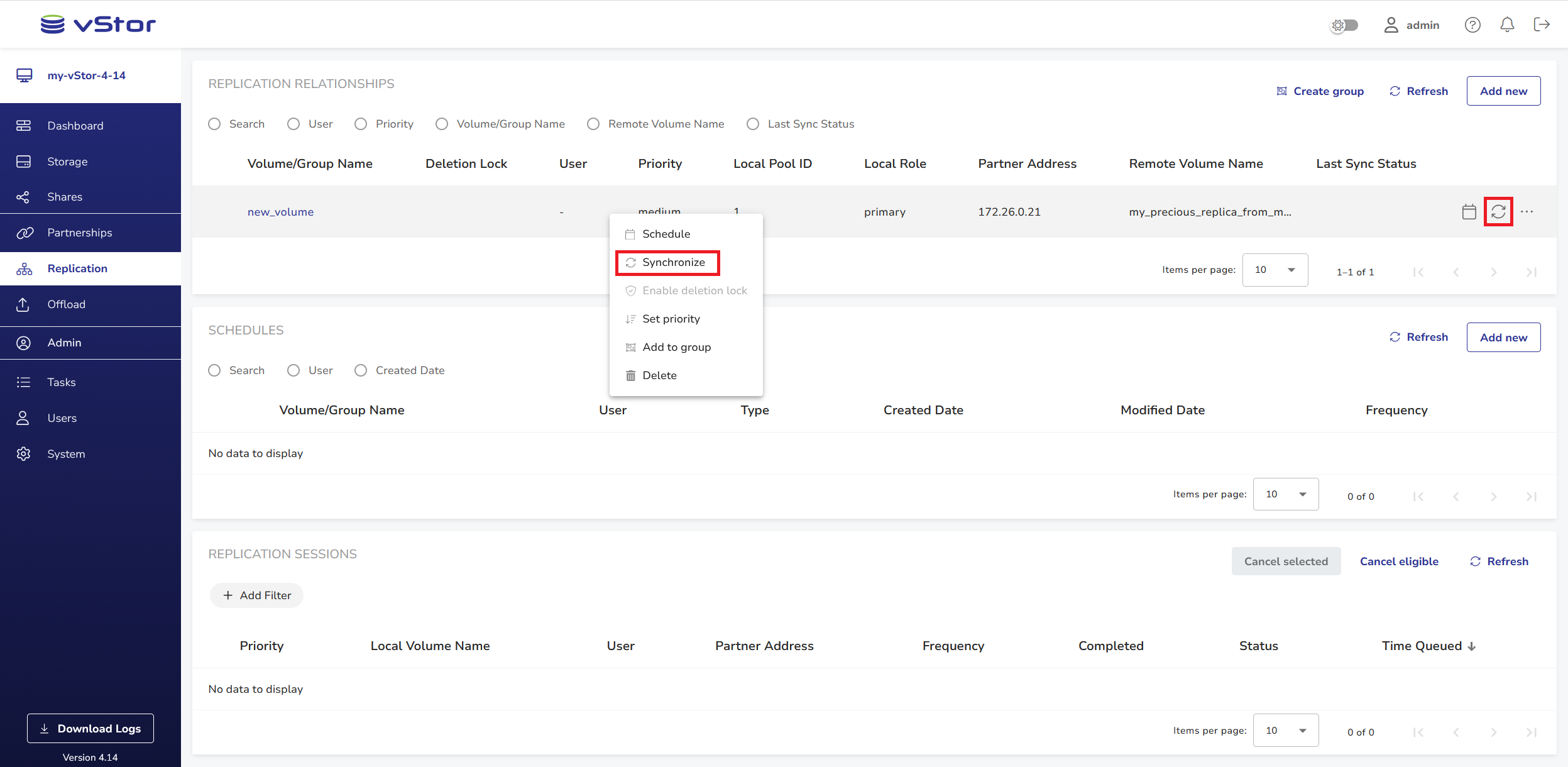 To manually synchronize data between the local volume and the replica on a partner vStor, hover over the replication relationship record or right-click the record and select Synchronize. The replication operation will be queued for synchronization.