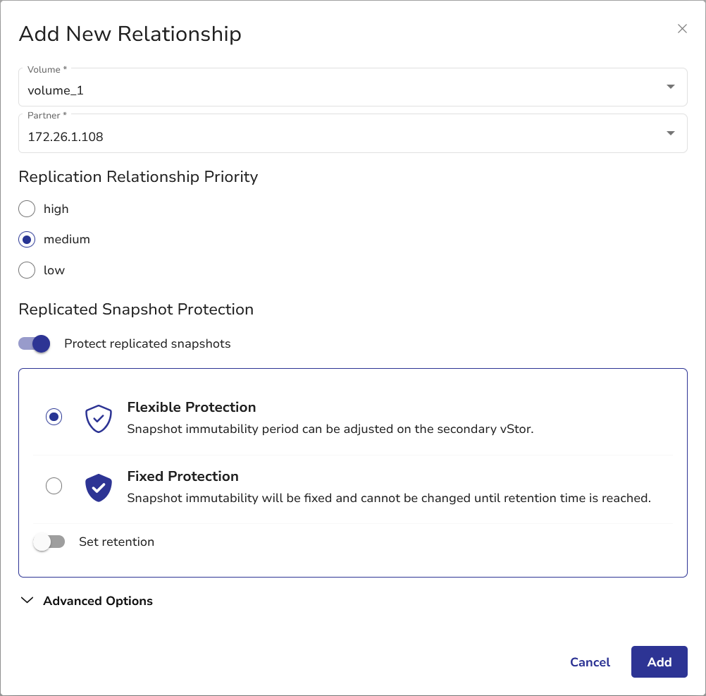 vStor allows enabling deletion protection for replicated data when creating new replication relationships. This feature creates immutable, Write Once Read Many (WORM) storage on the replication target, preventing any modifications or deletions of replicated data.