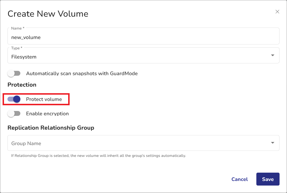 When creating any volume type (Filesystem, MinIO, LUN), switch the Protect volume toggle to on.