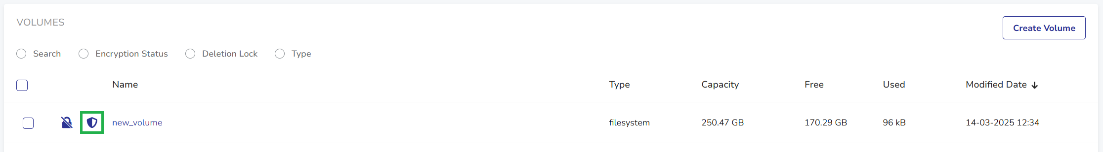 Protected volumes are marked with a shield icon in the volume view, indicating their protected status.