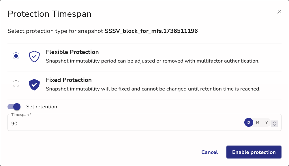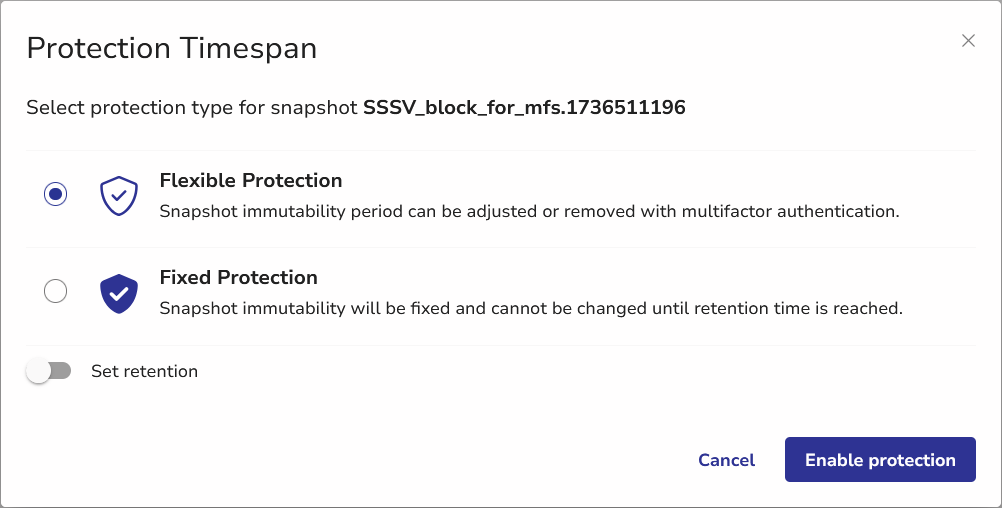 - A retention period must be set when applying a Fixed Protection, defining the duration for which the snapshot will remain immutable.