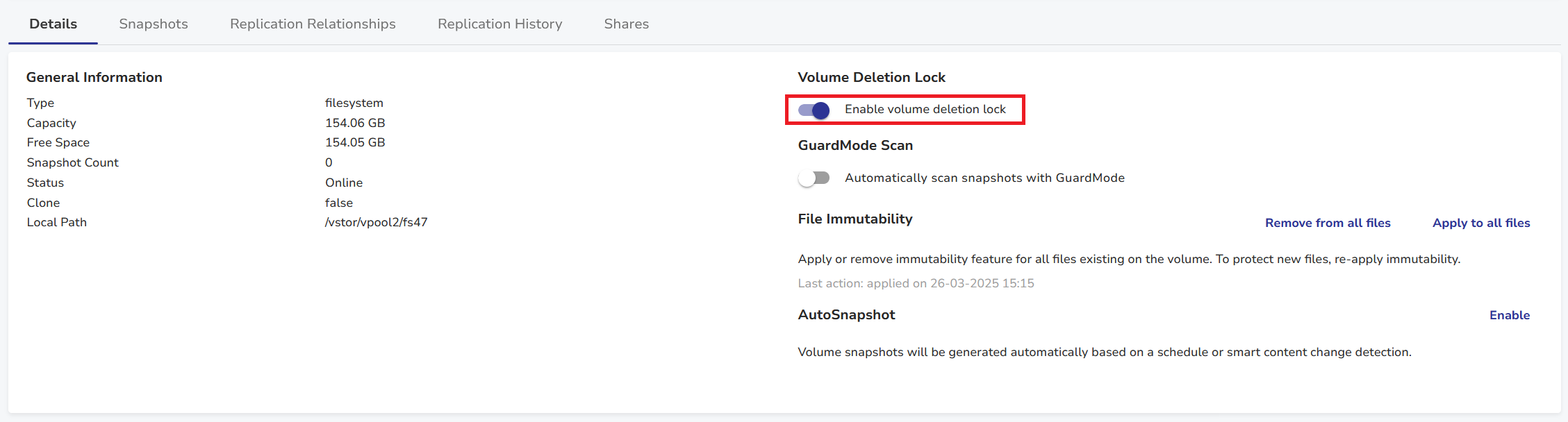 Immutability in vStor provides a robust mechanism to protect data at both the snapshot and volume levels, ensuring data integrity by preventing unauthorized or accidental modifications and deletions. This feature allows administrators to set holds on snapshots and enable protection on volumes, safeguarding critical data against ransomware attacks and other security threats.