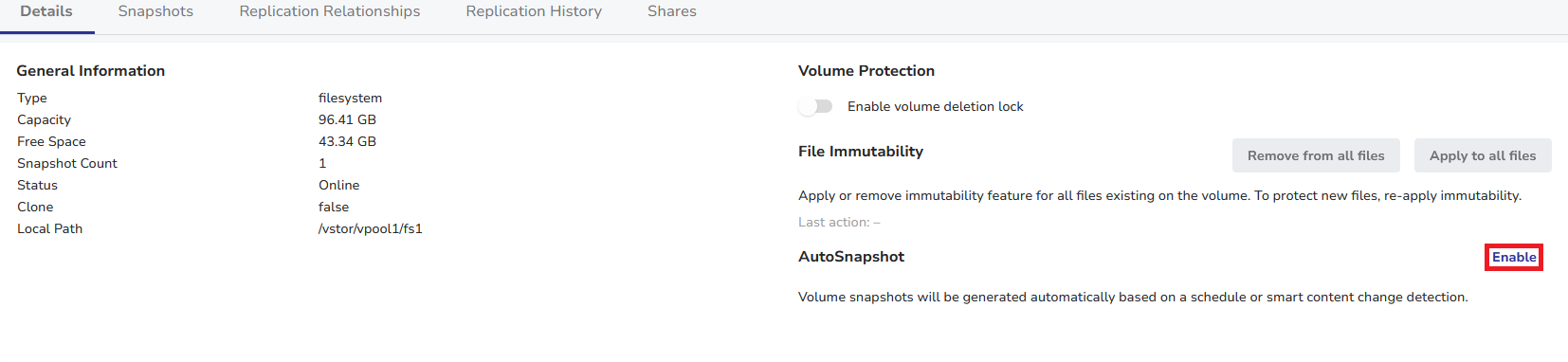 - In the detailed view, locate the AutoSnapshot section and click the Enable button.
